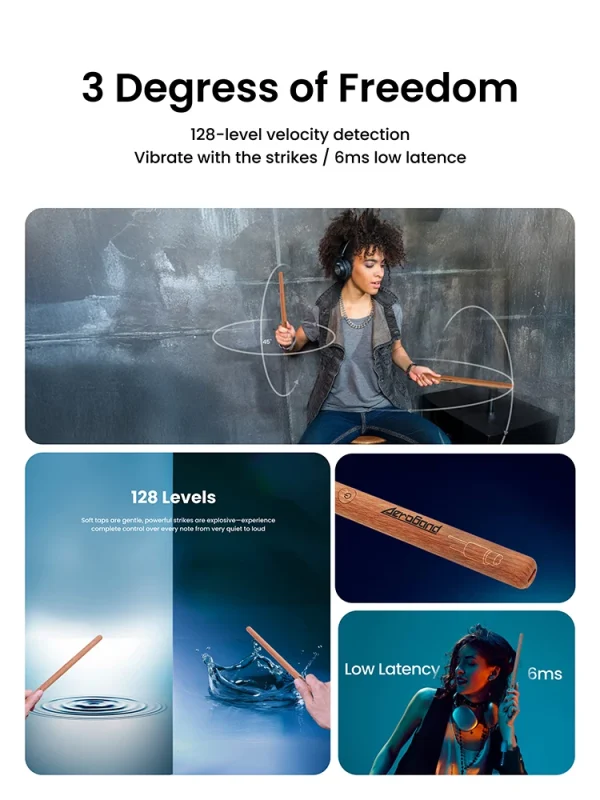 Composed of a pair of drumstick-shaped devices and two compact foot pedals, the set allows users to play various rhythms by striking in the air. The somatosensory technology within the product marks a startling progression from traditional electronic drum sets, activating a corresponding sound module with every swing. The drumsticks and foot pedals respond instantly to the playerβs movements, offering a real-time and immersive drumming experience.